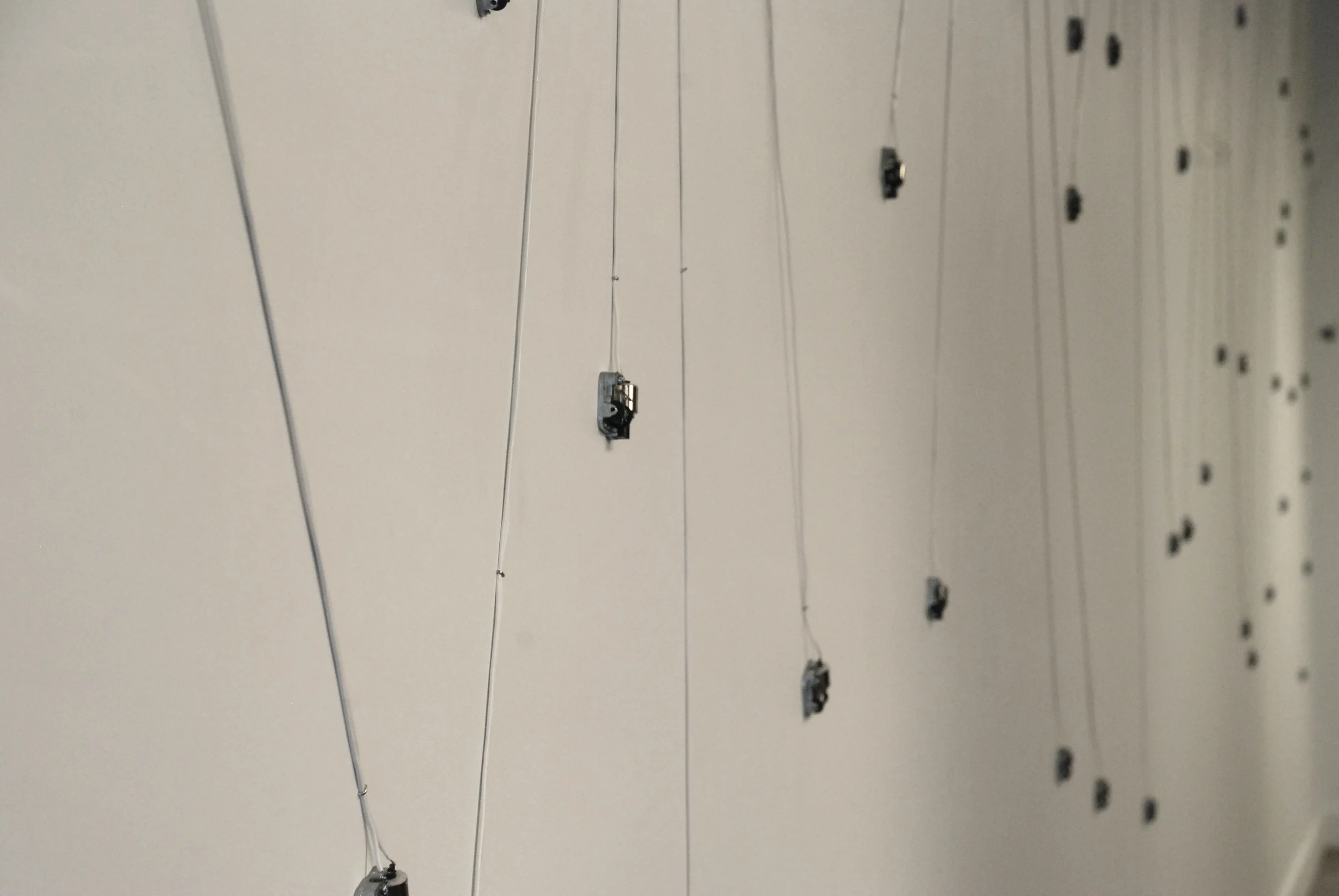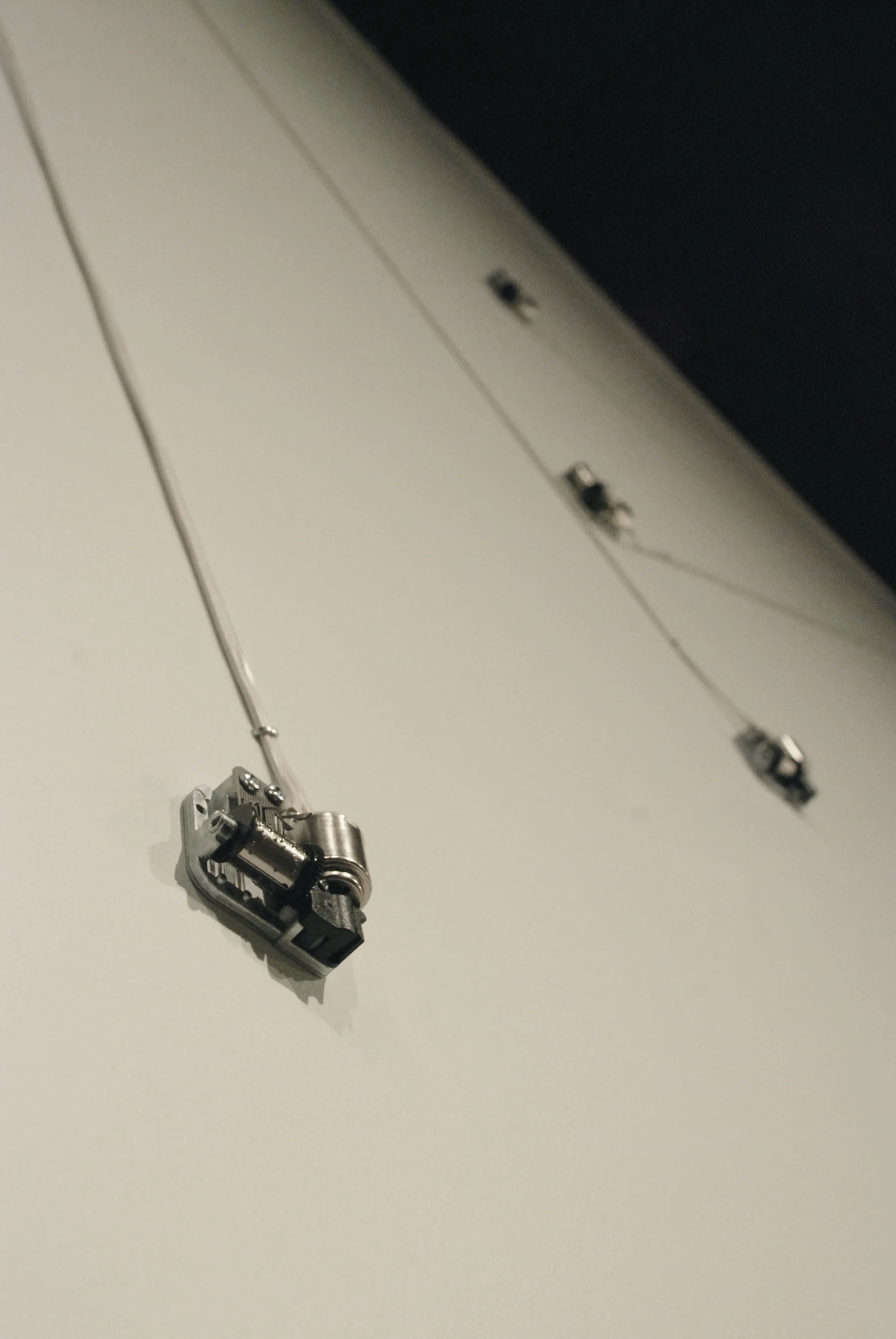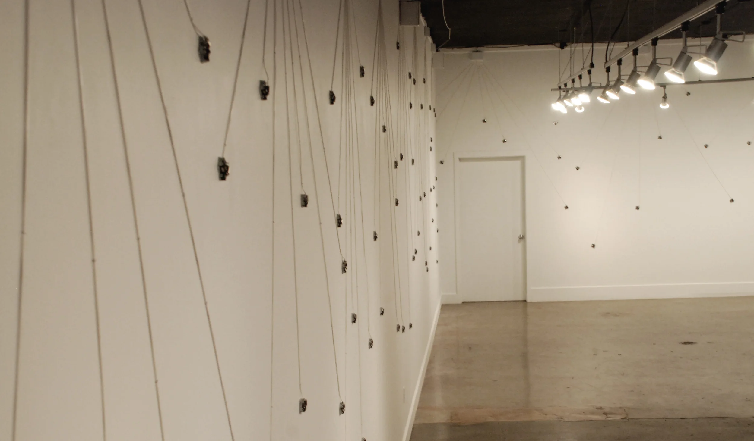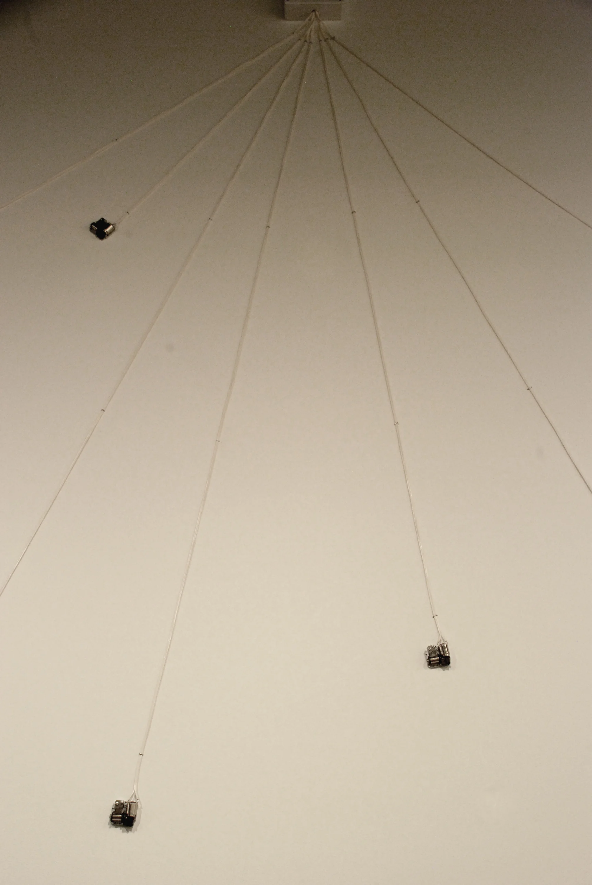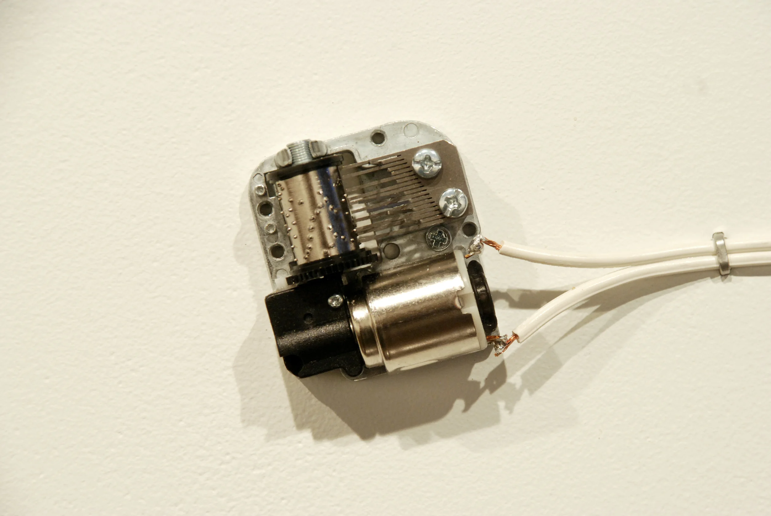 Movements consists of over one hundred manipulated music boxes powered by electric motors that are attached directly to the walls of a gallery. Rose altered and reduced the melody of each music box by selectively bending back tines. Through this process of intervention the manufactured machines become individualized by human influence. The altered motorized music boxes are grouped in sections throughout the gallery, each section connected to a timer that intermittently activates portions of the piece. The result is a constantly shifting composition that uses the gallery walls as a resonating body, effectively engulfing the visitor in sound.